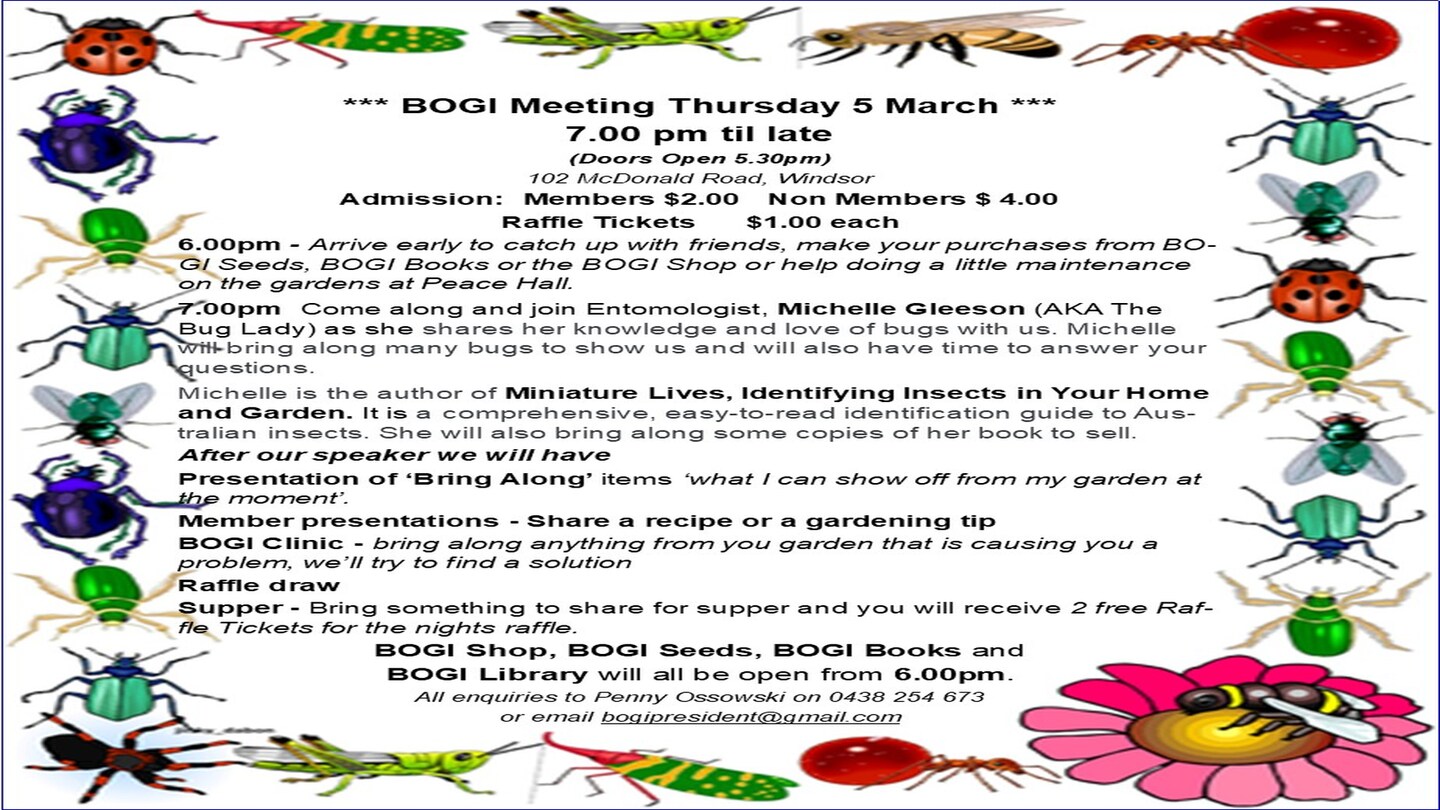 Come and hear Michelle Gleeson - AKA the Bug Lady, as she shares her knowledge and love of bugs. Michelle will also have copies of her book, Miniature Lives, Identifying Insects in Your Home an Garden, for $49.95. Please note Michelle takes cash only.